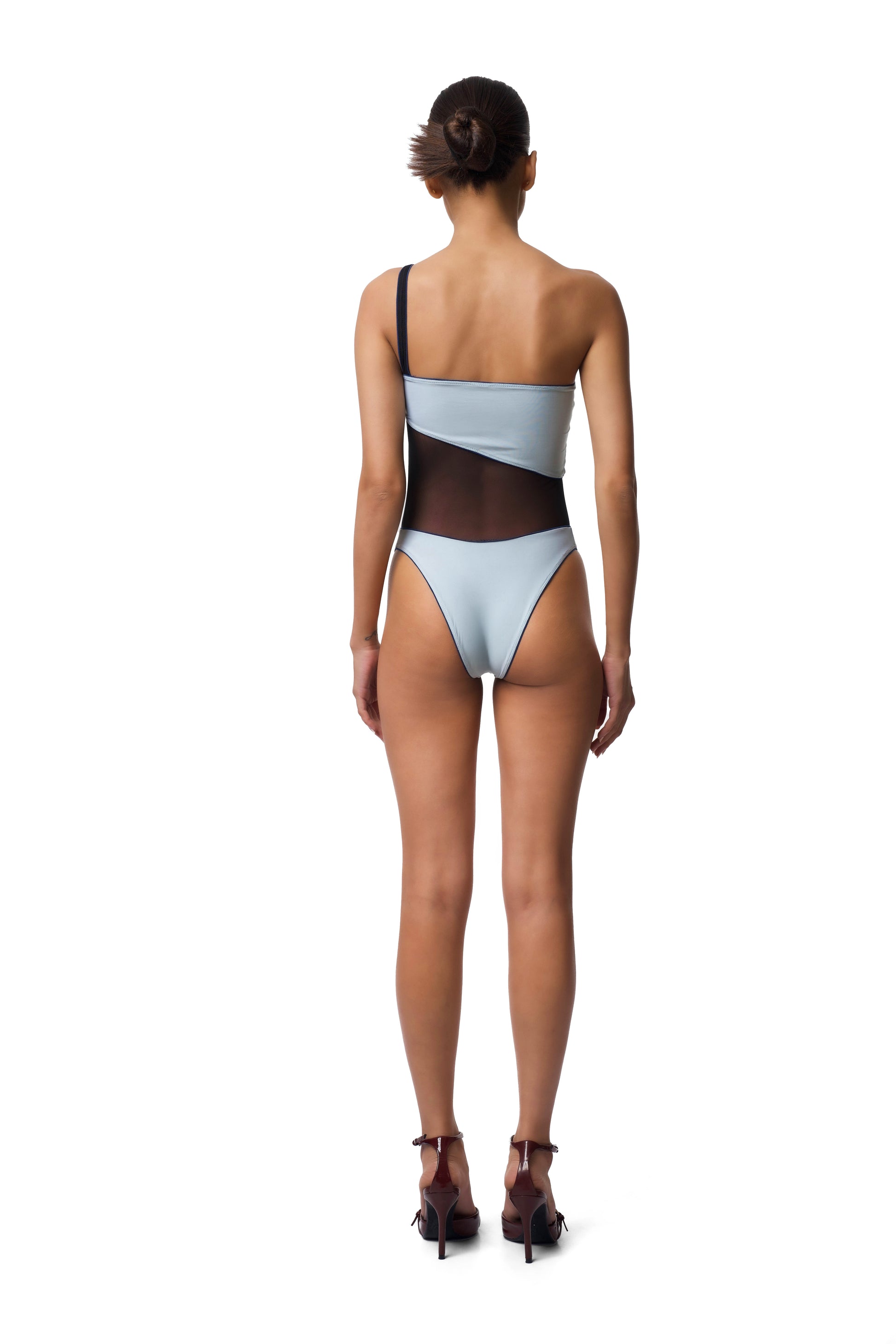 This bodysuit is a perfect blend of nylons and translucent sheer fabric that fits the body like a glove and elevates a timeless look.