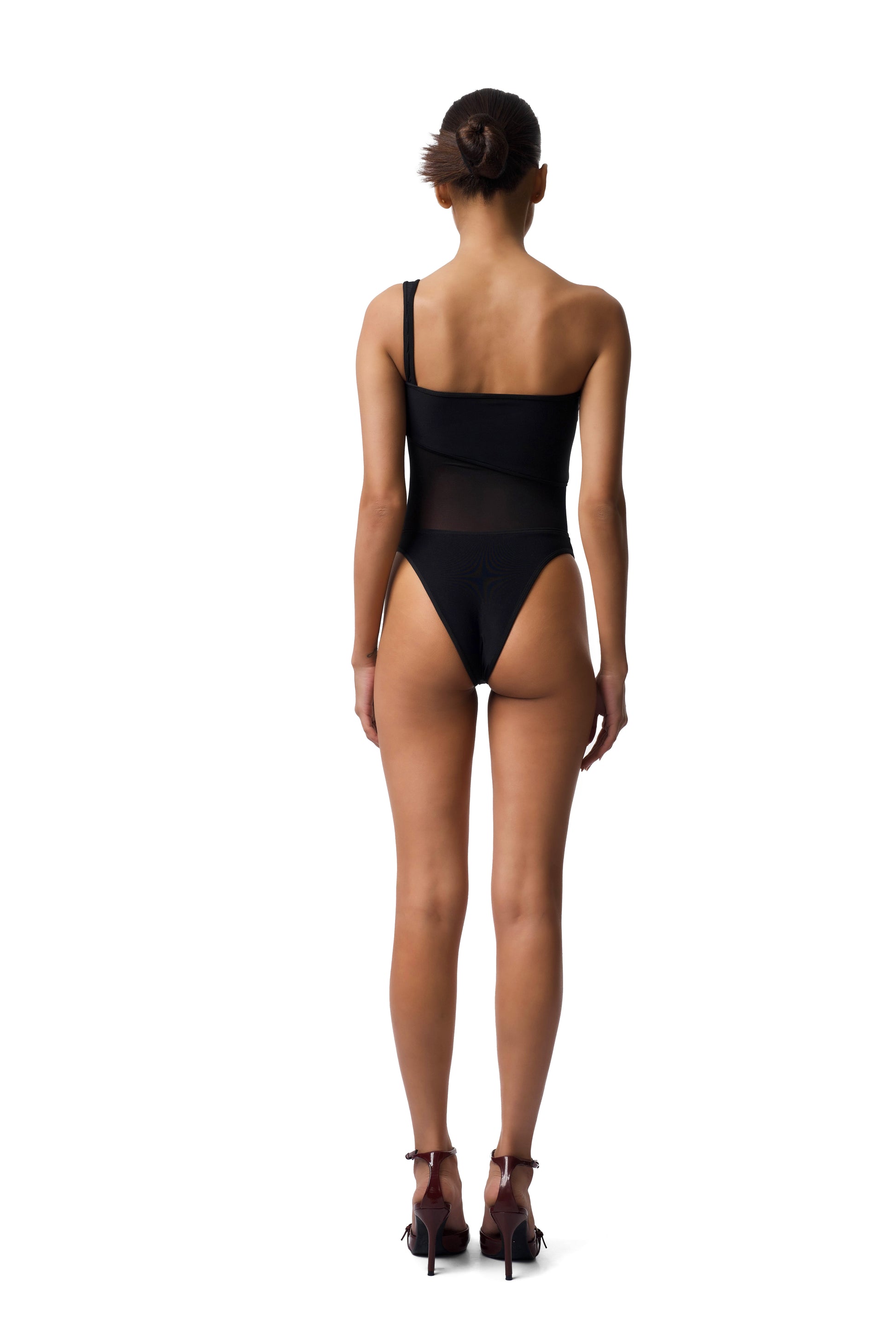 This bodysuit is a perfect blend of nylons and translucent sheer fabric that fits the body like a glove and elevates a timeless look.